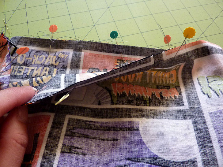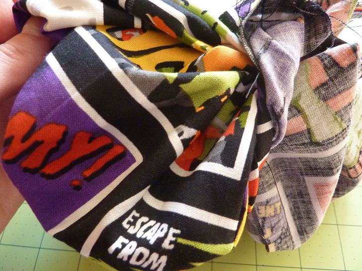 I am a major fan of B-Movies: the over-acting, the cheesy special effects, the see-through plot lines… I love it all. And, I am especially fond of B-Horror-Movies! I think this is because I could picture myself getting paid to scream like a maniac at a rubbery monster with googly eyes. When we originally spotted this Halloween movie poster fabric, we knew it was perfect for a colorful bag. This exact fabric is, unfortunately, no longer readily available, but each year there are lots of new spooky collections from which to choose, and a bag like this is the perfect excuse to use the brightest and boldest of the batch.