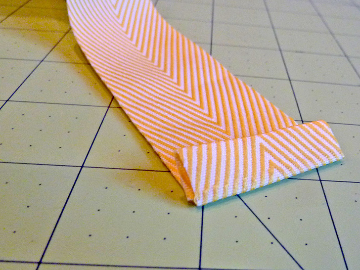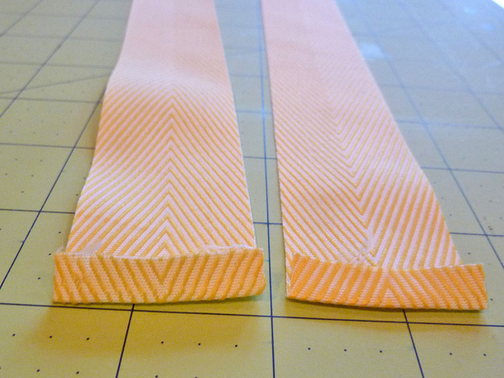 - Find the 30″ length of twill tape. On both ends, turn under the raw edge just once by ¼” and press.