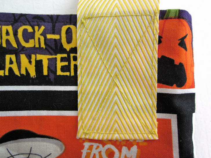 - Find the finished bag. Place it back side up on your work surface. Place the ¼” turned-under end of the 15″ length of twill tape at the upper right corner of the bag back. The right edge of the tape should be 1″ in from the side seam.
