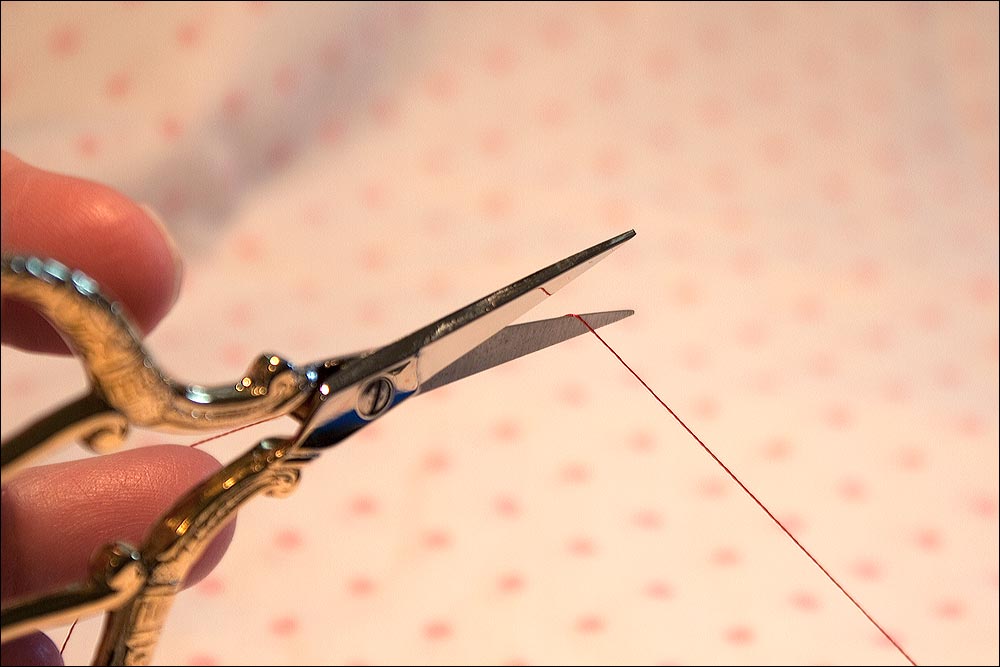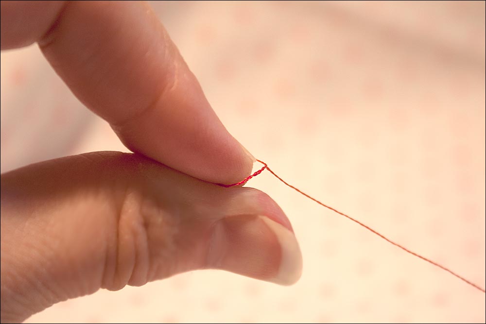 • Pass the freshly cut end through the eye of the needle. It’s easier if you slightly dampen the end of the thread first.