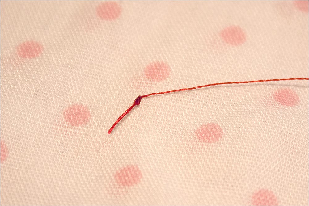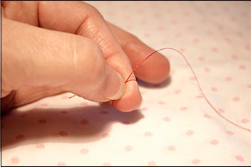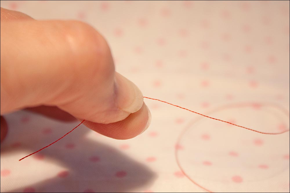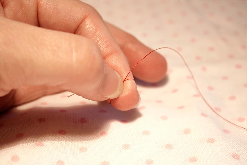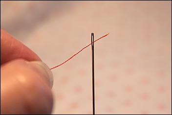• Pull the thread through the eye about 4 or 5 inches. This is the end that will remain unknotted.