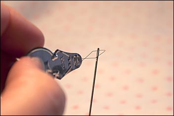 • Holding the needle and threader in one hand, pick up the thread and push it through the hole in the needle threader until it’s about 4 or 5 inches through the threader.