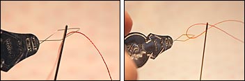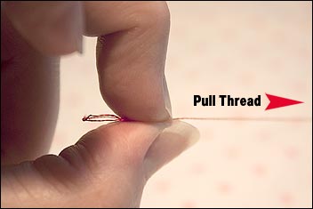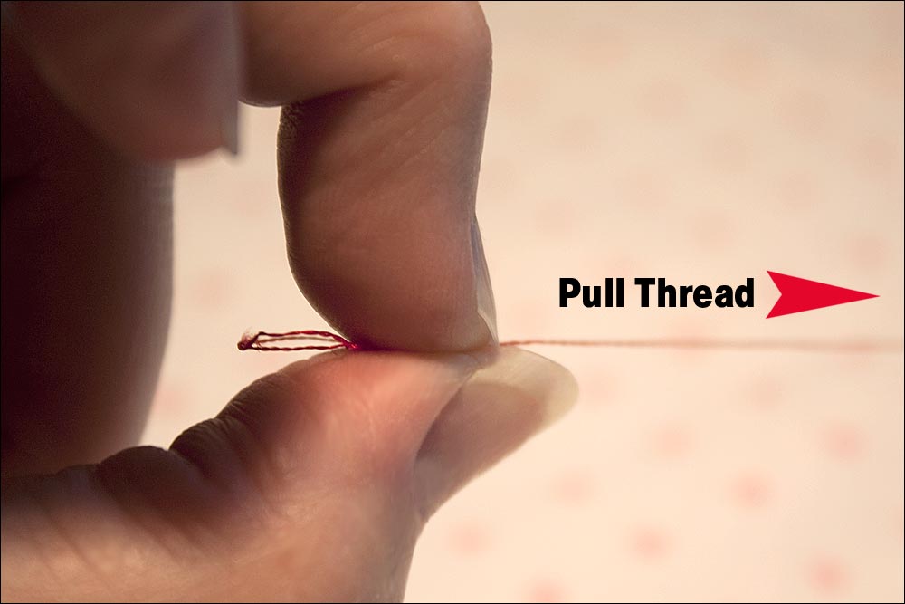 • Just as it slides off, use your middle finger to step on the loop and hold while you pull the thread into a tight knot.