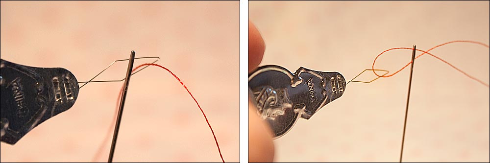 I have trouble with the thread sliding out of the needle as I pull the thread through the fabric. I used to pinch with my middle finger but I’m trying to learn to use a thimble and that makes it impossible to pinch thread at the eye. Any tips???