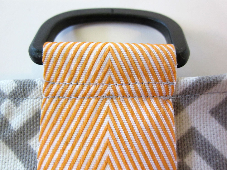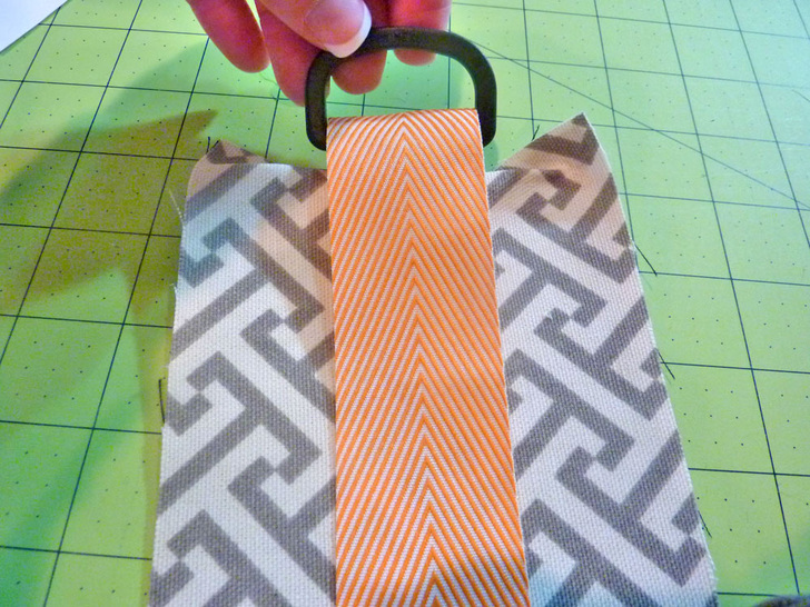 - Pull the D-ring up and out of the way. When the D-ring is pulled up into place, the tape should now lay flat against the back panel – not taut, but flat. Topstitch all the way around the top securing the second fold. Go slowly and carefully; you want your topstitching to be nice and straight.