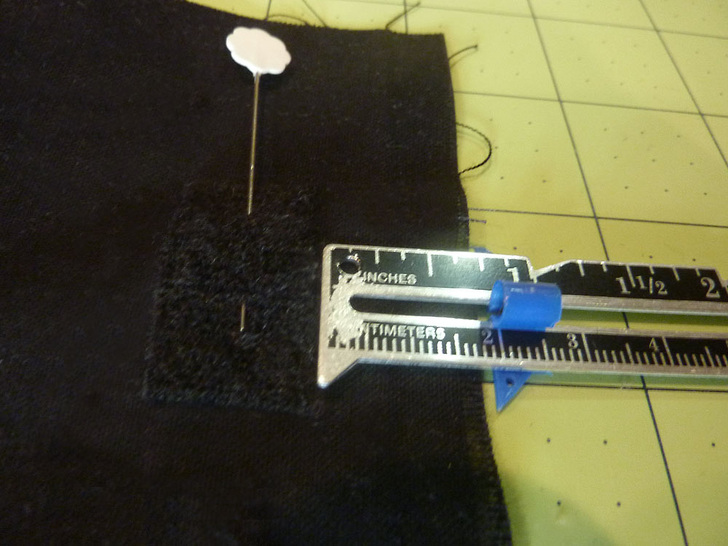 - Place one half of the Velcro® on the right side of each of the lining pieces. The Velcro® should be centered side to side and ¾” down from the top raw edge. Pin in place.