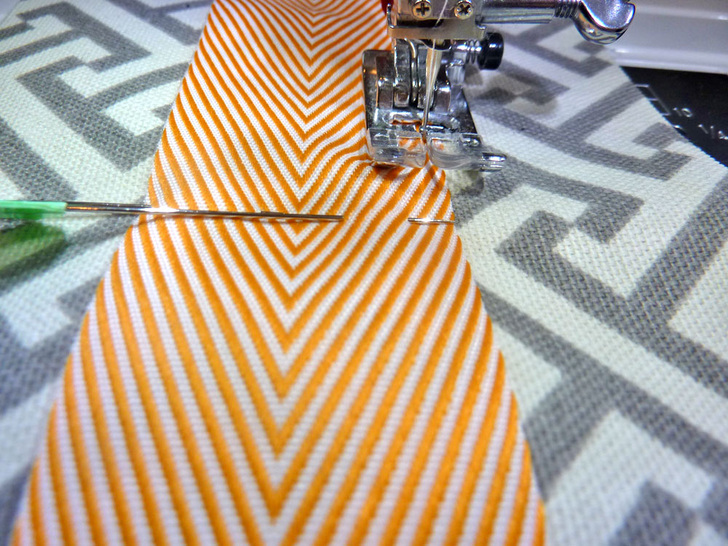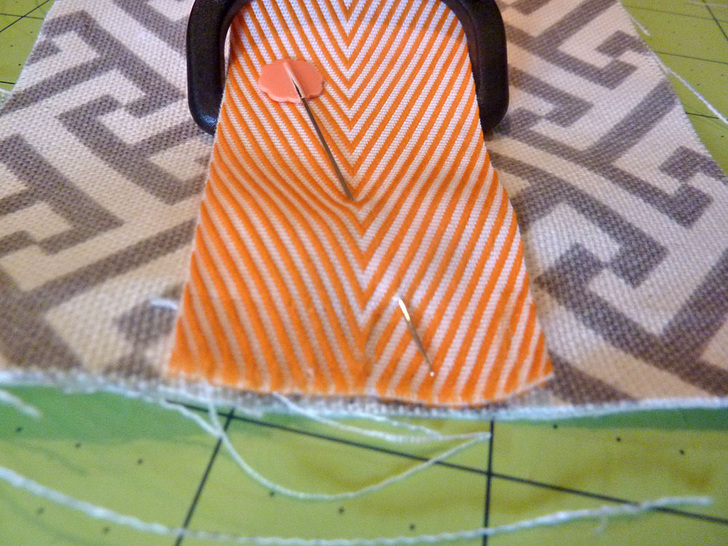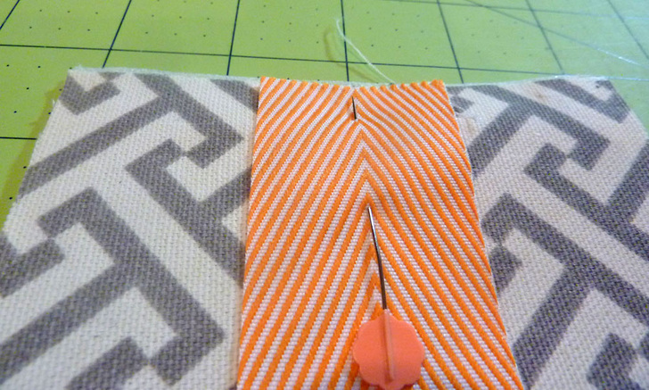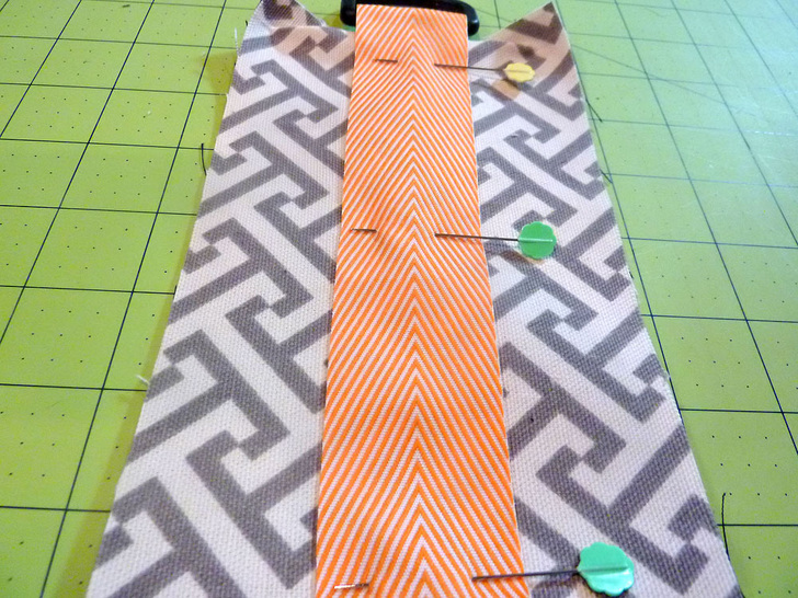 - Find the twill tape. Lightly fold the tape in half to find and mark its center point – for our sample, the center was the “v” of the chevron design. Align the center of the tape with the center line of the panel. The top end of the tape should be flush with the top raw edge of the panel (remember your lining is behind this panel, so the “top” is the end with the Velcro®). Pin the top end of the tape in place.