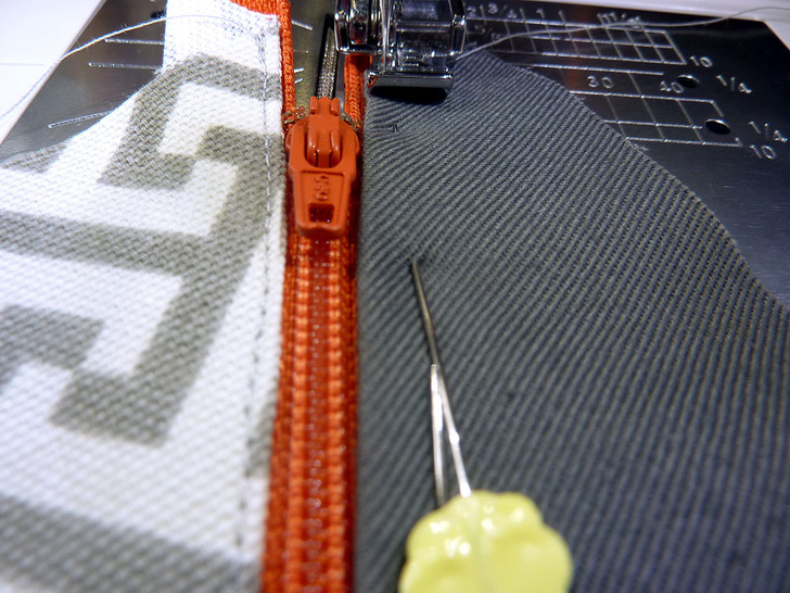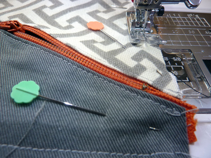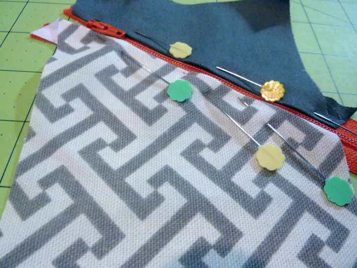 - Place the folded edges along each side of the zipper. The top zipper stops (where the zipper pull comes to rest when closed) should be approximately ⅝” in from the left side of the panel. Pin the top and bottom sections in place. The tail of the zipper will extend beyond the right edge of the panel by several inches. This is fine; you’ll trim away the excess when done stitching.