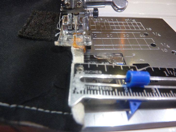 - On one side of the tape, edgestitch from the bottom up to the horizontal pin, pivot and create a 2″ X Box, then edgestitch back down the opposite side of the tape.