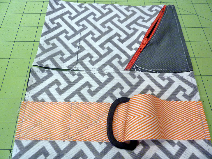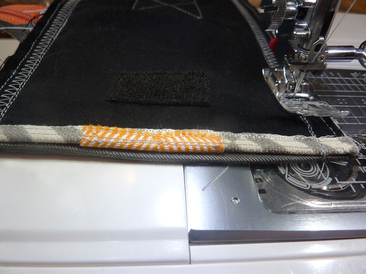 - Attach the Zipper foot. Sew one additional short seam at the back across the tape at the very top edge. This helps secure and strengthen the loop for the D-ring.