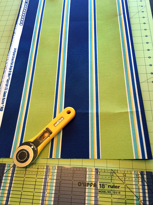 - As mentioned above, cutting wide panels of fabric can be challenging. It’s best to fold the fabric in order to cut at a more manageable size. Check out our article: Rotary Cutting Large Panels in One Fell Swoop. If using a stripe as we did, a clear ruler will help keep things straight.