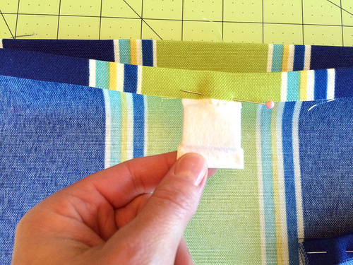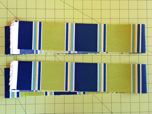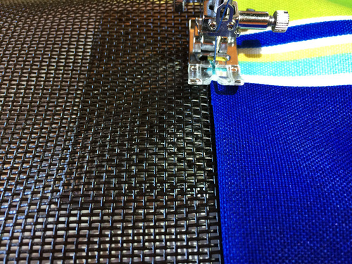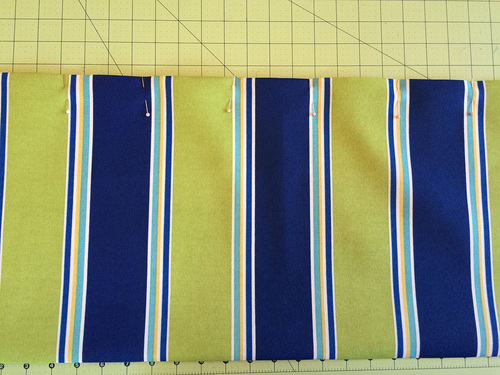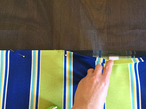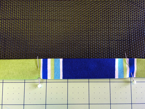 - Slip one binding strip over each raw side edge of the center pet screen panel and pin in place. The horizontal stripes will look best if they are even side to side.