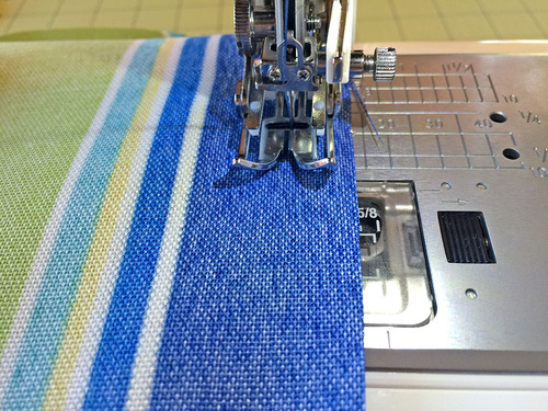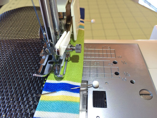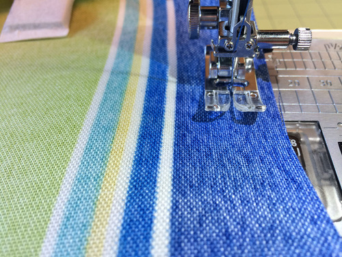 - Edgestitch each strip in place from top to bottom. Go slowly to insure you are catching both the front and back of the binding in the seam. We used our Janome Even Feed foot.