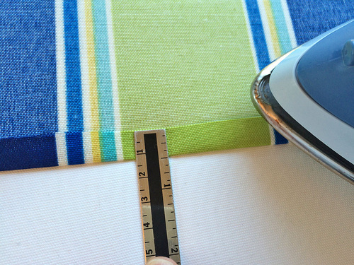 - Find the top 25″ panel. Fold back each WOF raw edge ½” and press.
