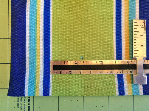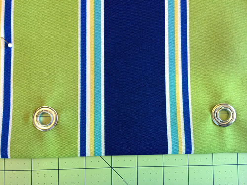 - From the top folded edge, measure and mark to equally space EIGHT grommets. We used the wide green stripe in our fabric as our guide, centering each grommet within a green stripe…