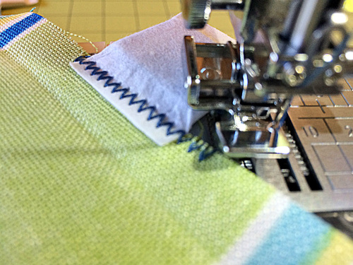 - Unfold the hem and zig zag each weight in place to keep them secure during the rest of the construction. Be careful setting the swing of the zig zag. The top flat tab is quite narrow and you don’t want your needle to hit the enclosed weight. We used a Zipper foot to get in close enough.