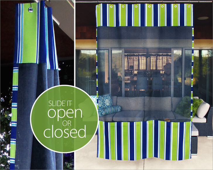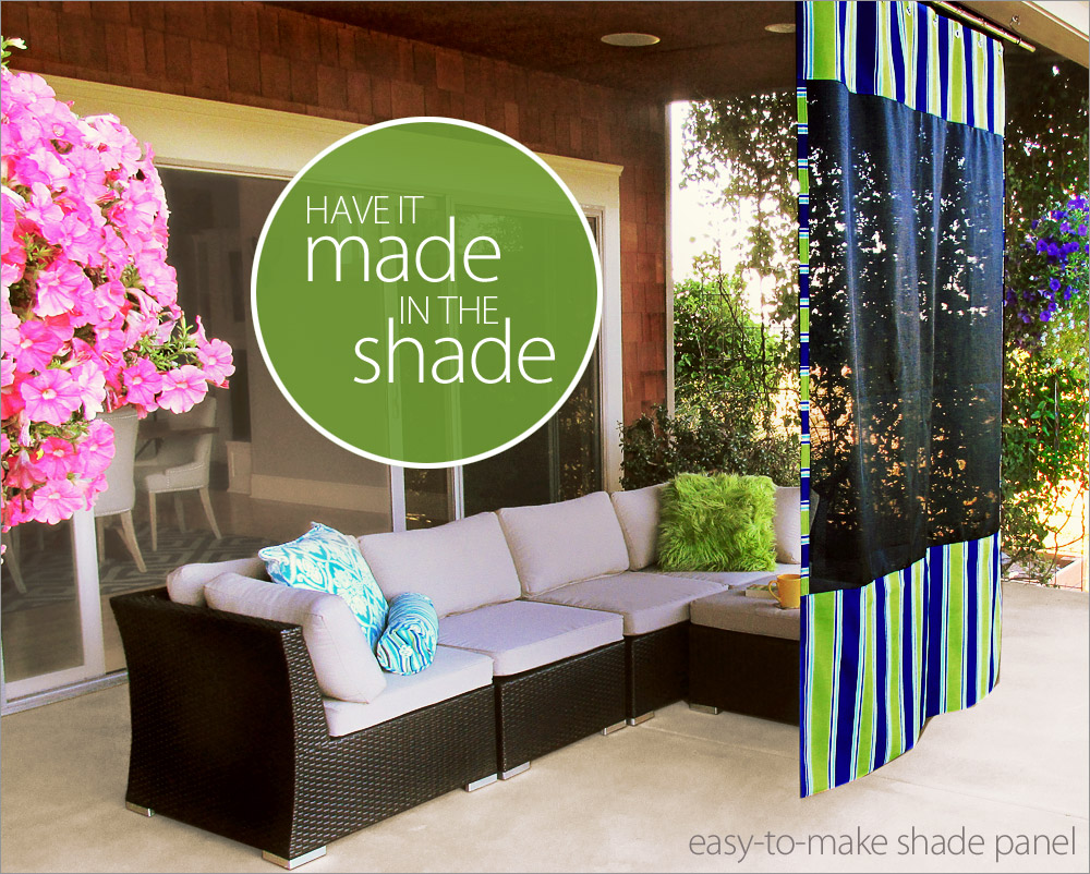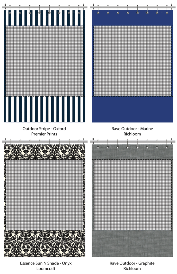Ahhhh; it’s a lovely summer day on the patio. Blue skies, bright sun… actually, really bright. Blinding might be a better word! If you have an outdoor living space you likely also have one or two areas that always get blasted by the sun, making them virtually unusable at certain times of day. Enter our innovative Shade Panel solution. It’s an outdoor curtain with a center screen that filters in light while blocking out the worst of the blinding rays – all without destroying your view. We combine outdoor fabric with pet screen for durability.