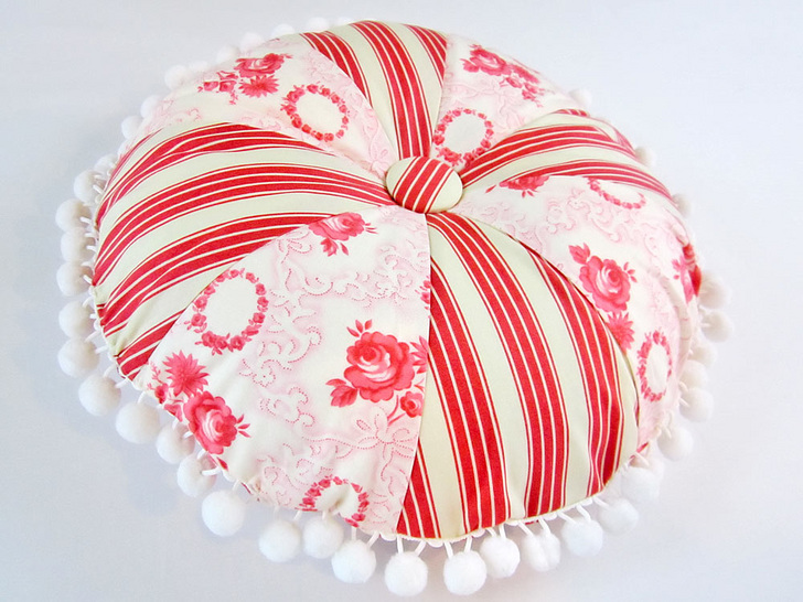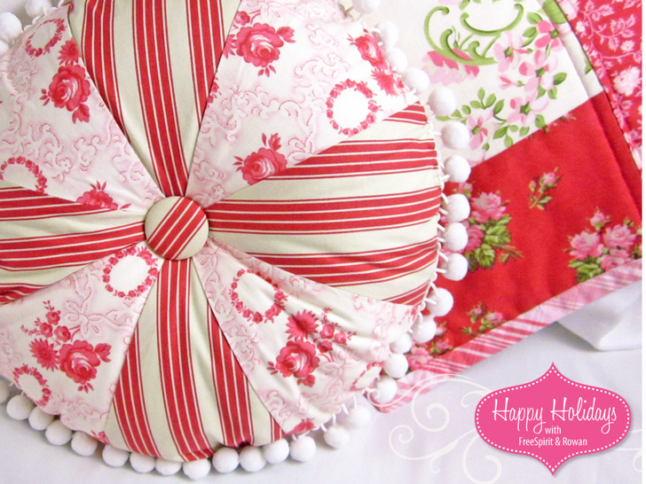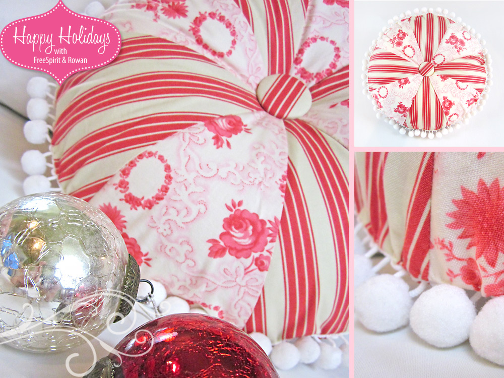 Some pillows are elegant, some are functional, and some are just pure entertainment. Our chubby little peppermint candy of a pillow, in fabrics from Verna Mosquera’s new Pirouette collection for FreeSpirit Fabrics, is just that: jolly good fun! We spun alternating wedges of fabric into a darling pinwheel pattern ringed with poms… because you simply can’t look at bouncy pom poms without smiling. This is a pillow that will brighten any surface it lands on. Today’s our last day working with the vintage loveliness of Verna’s new Pirouette – her ninth collection for FreeSpirit, which will begin appearing next month, December 2012, at participating online and in-store retailers.