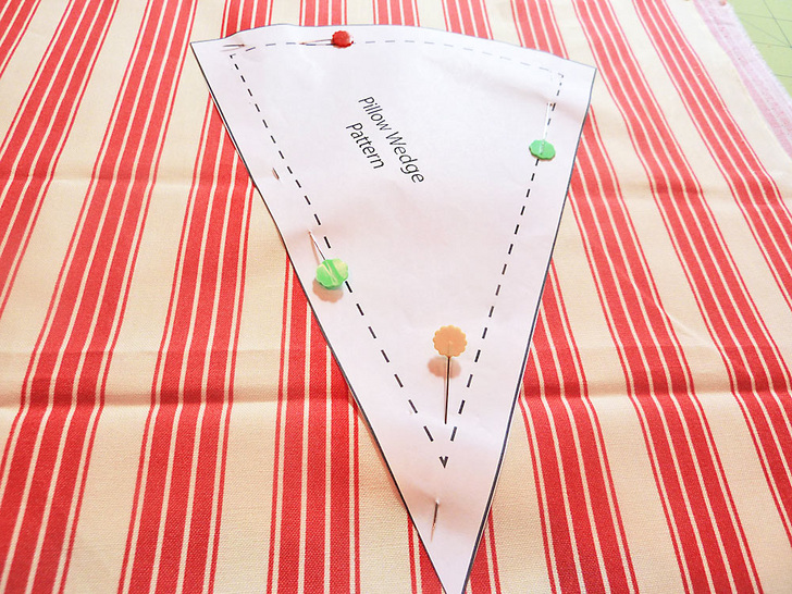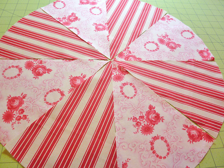 NOTE: Be sure to watch the grain direction of your fabric. Your pieces will have some stretch to them, so handle each one with care to retain its shape. - Lay out the wedges in order for both the front and back of the pillow (the sides are identical). The two fabrics simply alternate around the pillow.
