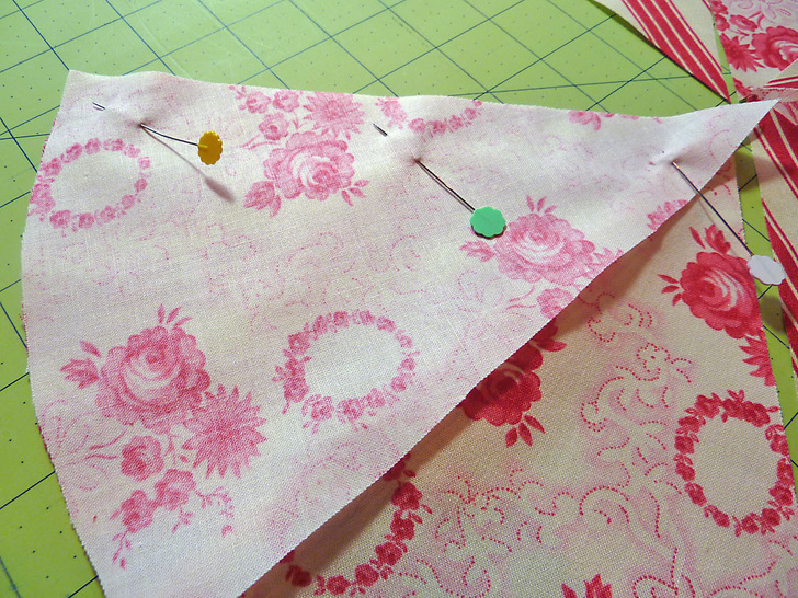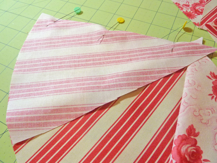 - Select the next wedge in the sequence. Place it right sides together with the sewn pair. Pin along one side. As above, align the bottom curved edges and let the top points overlap.
