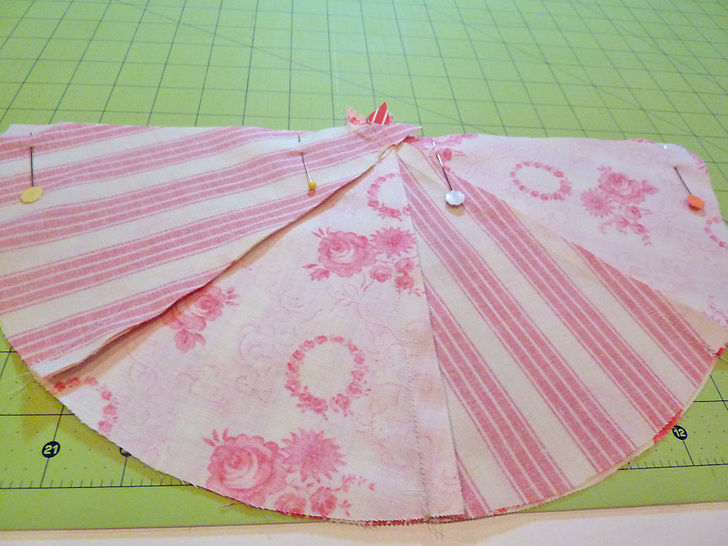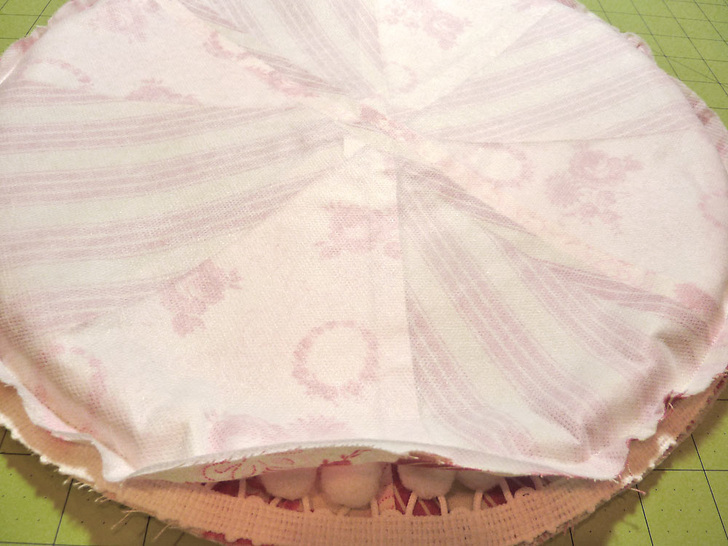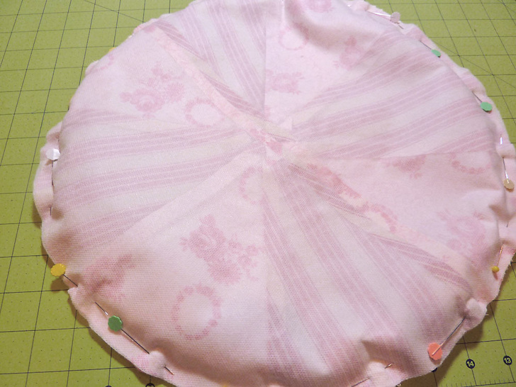 - Layer front and back right sides together, carefully matching all the front and back wedge seam lines. The poms will be sandwiched between the layers.