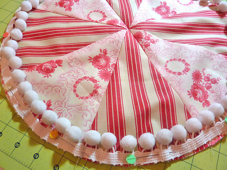 - Place the front pillow circle right side up on your work surface. Pin the pom pom trim around the entire outside edge.
