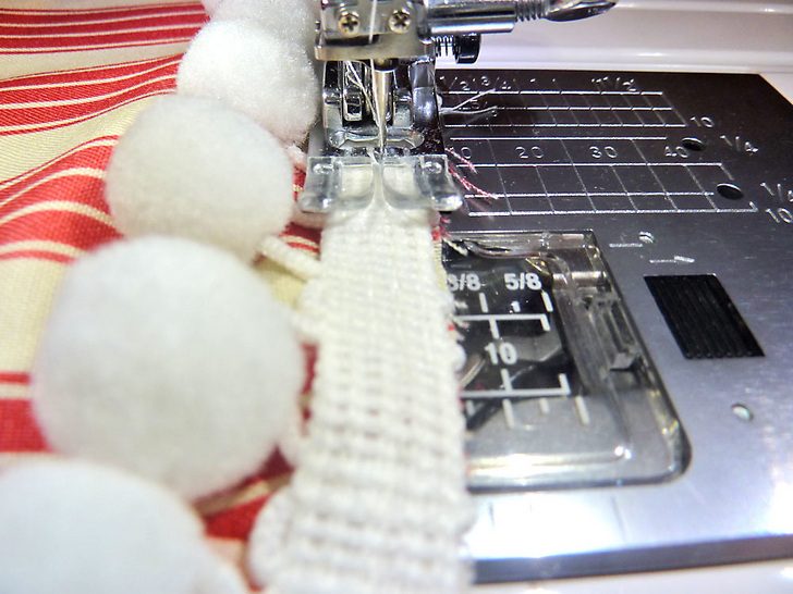 NOTE: If you sew with the front of the pillow on top, on which the pom pom trim was original basted, you can use your basting as a guide to help you stay nice and close to the pom pom trim. The Zipper foot helps you keep a tight line of stitching. - Turn the pillow cover right side out.
