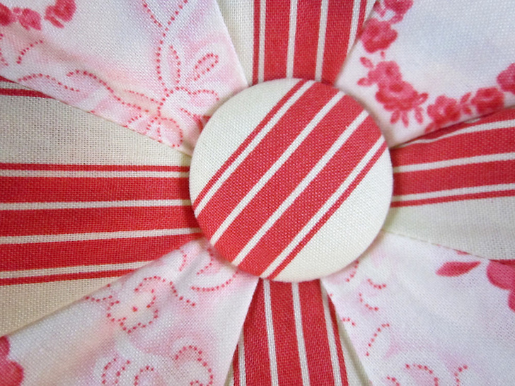 - Make two covered buttons using the leftover fabric from cutting out the wedges. We fussy cut ours from the Vintage Ticking stripe to create a pretty center feature. Then we stitched it on so the button stripe was at a diagonal to the wedge stripes. Also, we always add a small scrap of lightweight batting under our fabric for a smooth, curved shape to our covered buttons.