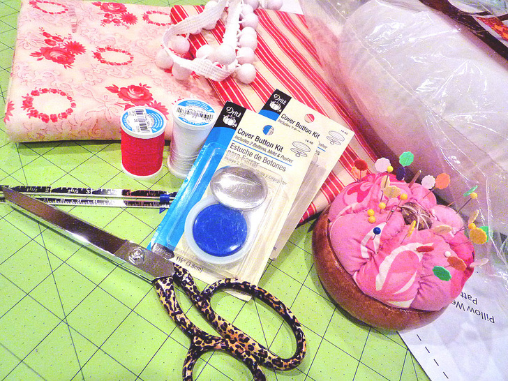 NOTE: If you are new to covering buttons, we have two tutorials, one using Covered Button Kits (what we did here) and one about Making Your Own. - Thread a hand sewing needle with button or carpet thread. Hand sew one covered button to the pillow front and one to the back. Pull the buttons tight so they create a nice, tufted effect.