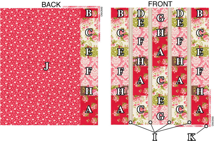 - Using our diagram above as your guide, assemble the FIVE vertical patchwork panels for the quilt front, plus the ONE vertical panel for the quilt back. To do this, it helps to sort out the fabric cuts needed for each panel and stack them in the order to be sewn.