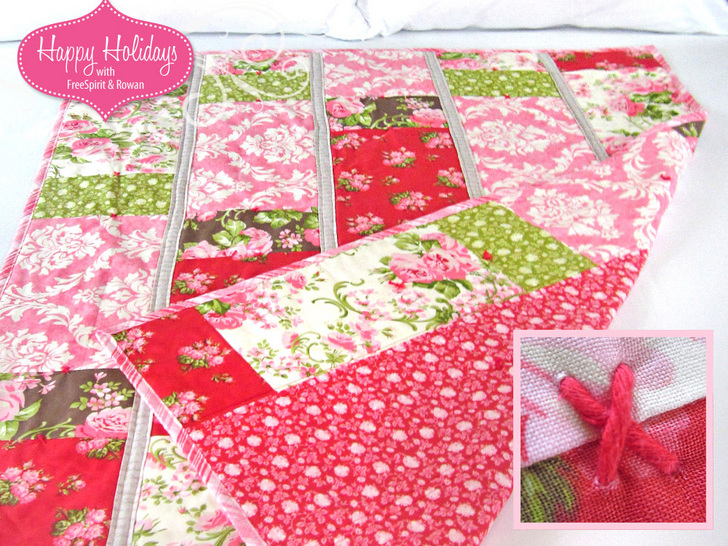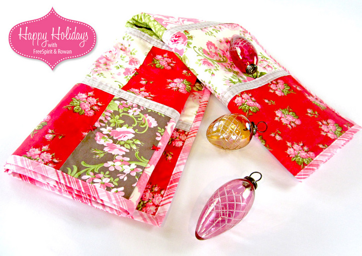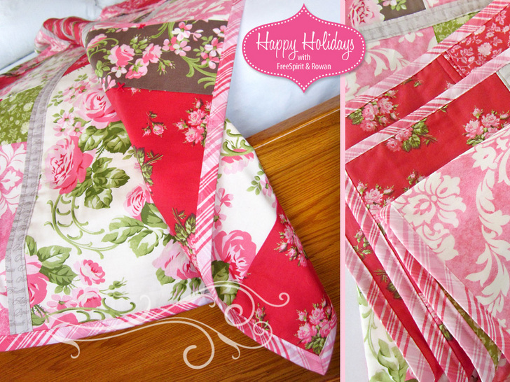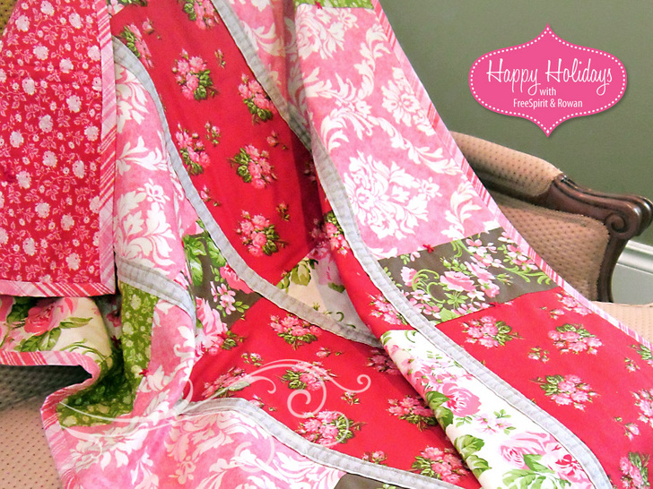 One question that always stumps me is when someone asks, “What’s your favorite color?” Whoa! It depends on my mood, which colors I’m working with that day, what design everything is spun into… and probably about a dozen other factors, including time of year and what song is playing on iTunes. I think I’ve loved each and every color at one time or another. That’s what’s so wonderful about patchwork – you get to blend all kinds of colors and patterns. Pieceing and patchwork are about choosing more not less! Today’s beautiful throw uses NINE different fabrics from the new Pirouette collection by Verna Mosquera for FreeSpirit Fabrics. From tiny rosebuds to bold damask to a pink and white tartan, Verna has created a romantic medley of sweet treats. As a holiday project, we anchored our throw’s design with a traditional rich, ruby red; then softened the palette with prints from her Flamingo, Moss, Opal and Mocha colorways. Like all the projects within our Happy Holidays with FreeSpirit & Rowan series, today’s Priouette throw is a simple yet classic creation executed in gorgeous fabrics – perfect for holiday giving and decorating, but with a beauty that will last year ’round.