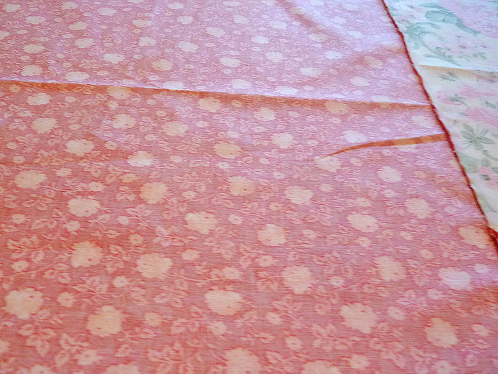- Working from left to right, lay the first two panels right sides together, along the RIGHT 60″ edge of the first panel and the LEFT 60″ edge of the second panel, matching the raw edges. Pin in place. Don’t worry is there is a bit of excess top to bottom, you can trim everything flush later.