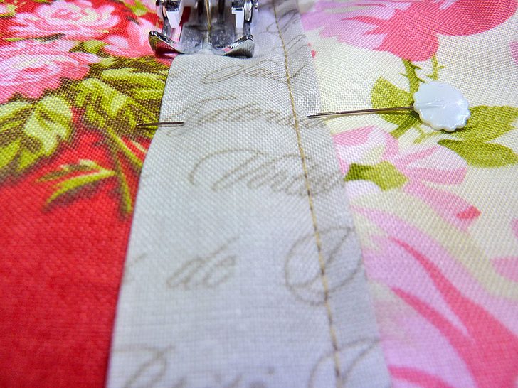 - Center one strip over each vertical seam on the quilt top. Pin in place. If you are new to quilting, you may want to go to the extra step of hand basting the strips in place.