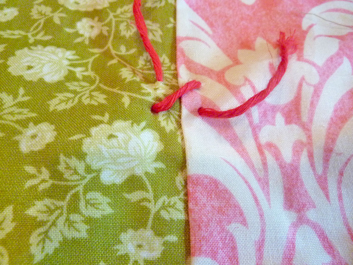 - For additional horizontal quilting, and also because it looks quite pretty, we added hand-stitched and tied yarn Xs at each horizontal seam.