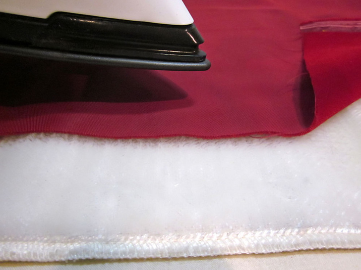 For pressing, follow the exact same method as for velvet. Set your iron for the cotton setting. Steam press ½” above the actual fabric on the wrong side, using a velvet or pin board (or other nap fabric or a plush bath towel). Don’t forget to use a pressing cloth.