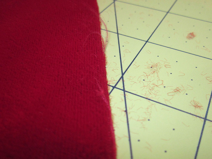 Depending on the type of velvet, it can be helpful to place a layer of tissue paper on the cutting surface first. The tissue helps keep the velvet steady.