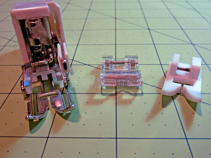 Even Feed foot – (Left in picture) Many sewing machine models come with this foot, also known as a Walking foot. It has a separate set of feed dogs that work in conjunction with the feed dogs on the machine to help evenly feed bulky fabrics under the needle. This is a great choice for velvet.