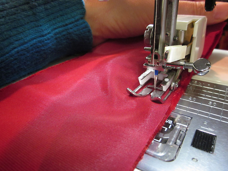 To sew, use a straight stitch. Adjust the length to approximately 2.0 – 2.5mm for best results. Remember to sew in the direction of the nap, holding the fabric taut in front and behind the needle, as shown above for velvet.