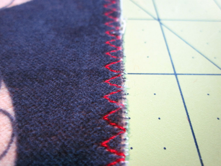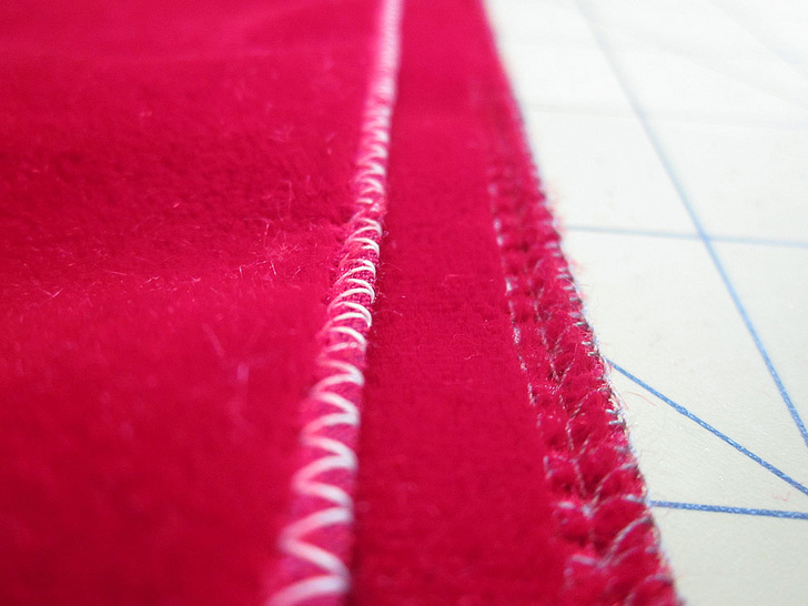As we mentioned, velvet tends to fray and shed. Therefore you have to finish the raw edges, unless they are concealed inside a project. You can use pinking shears, zig zag (or multi-zig zag if you have it) the edges on a sewing machine, use an overlock stitch on a serger, or sew a Hong Kong finish. Below, we used a basic zig zag (left) and an overlock stitch (right) so you could see the difference.