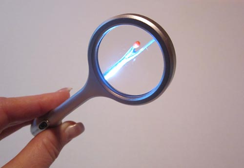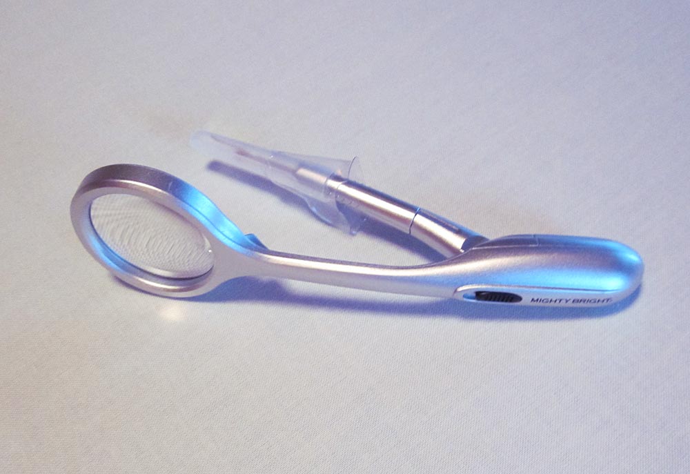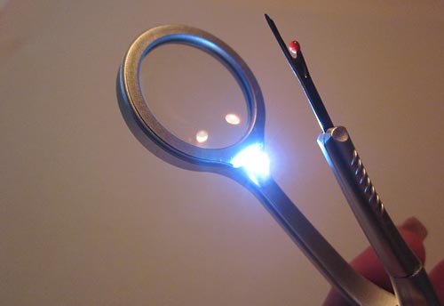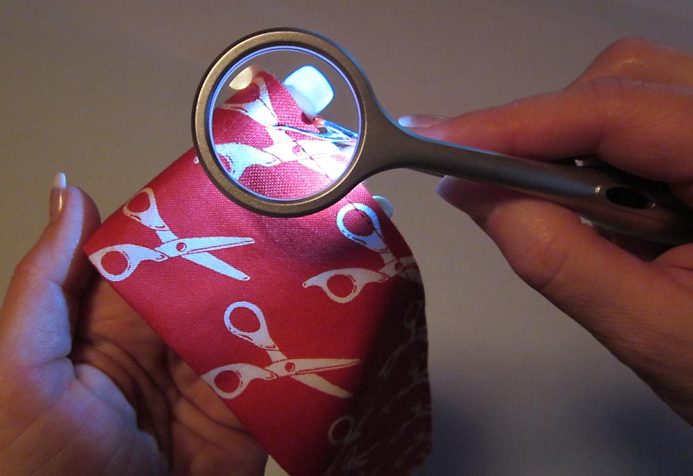 The Mighty Bright Lighted Seam Ripper is small and lightweight with a generous 1¼” diameter lens and a 4x magnifier. It has a comfortable, ergonomic design; you hold it similarly to how you’d hold a pen or marker.