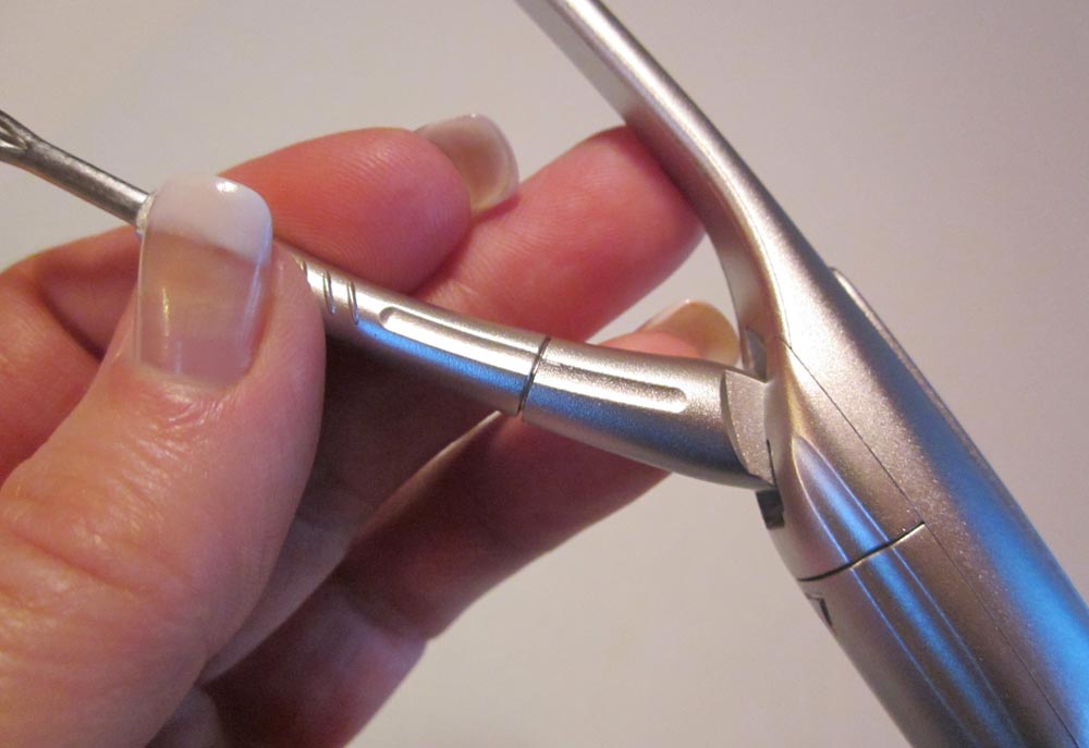 The seam ripper itself is on a rotating arm, which I thought was very cool because sometimes you need to be able to twist and turn your seam ripper to get into tricky seams. You can do that with a regular seam ripper, but I was a little worried it would be hard to maintain the position of the magnifier when I had to turn the seam ripper. Nope! Just turn the arm. It’s a little hard to see in a picture, but here is the arm in its starting position.