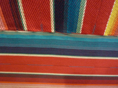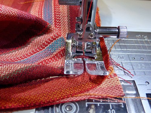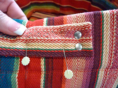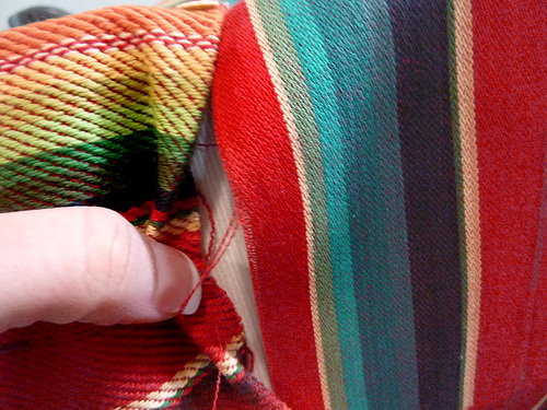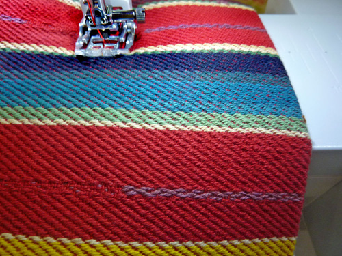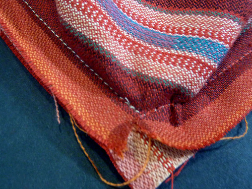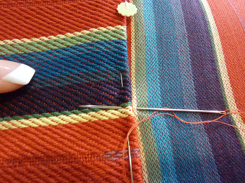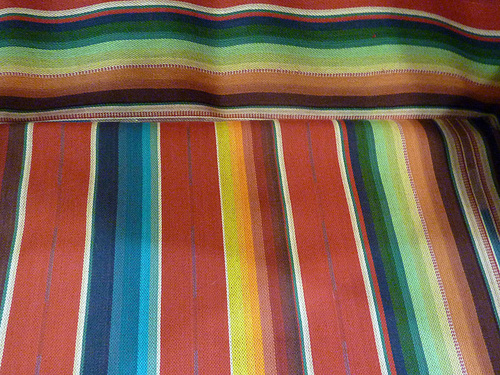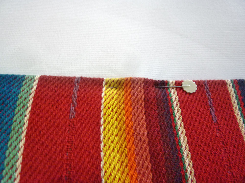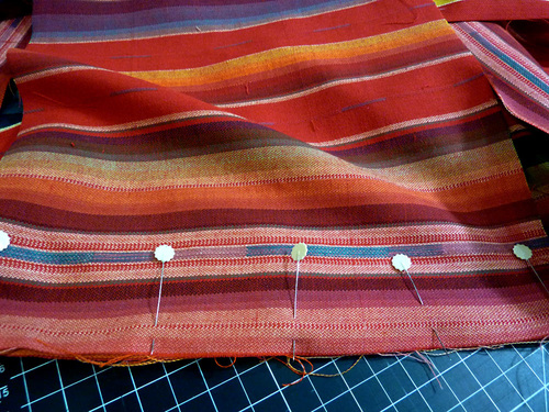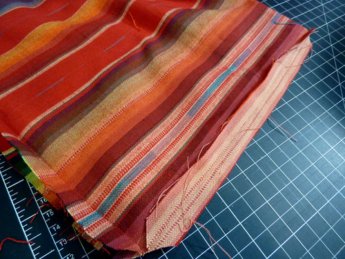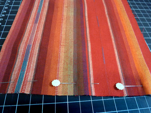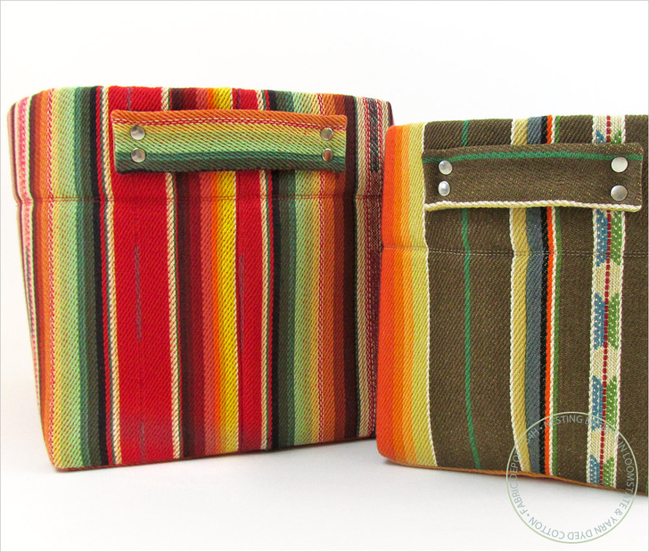 This is some of the most interesting and beautiful fabric we’ve ever worked with! We were immediately drawn to the gorgeous woven stripes and saturated colors. Then we touched it! The texture and drape is amazing. It is called “loomstate” fabric, which means it is completely untreated; it is woven fabric exactly as it comes off the loom: unsinged (singeing fabric is burning off protruding fiber ends from the surface of the fabric), unsanforized (sanforizing fabric is a multi-step mechanical process of shrinking and fixing woven cloth), and unskewed (skewing fabric twists the weft and warp yarns to flatten and finish). It is truly fabric “in the raw.” The first denims were traditionally loomstate fabric, but for years, it’s been obscure and nearly unavailable due to its unusual properties. Recently, loomstate has begun to show up again as people look for more natural and organic options in sewing.