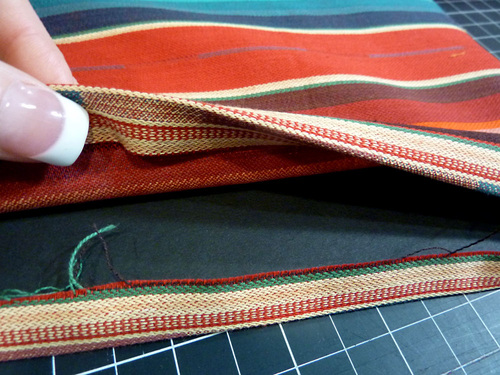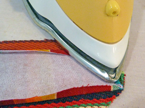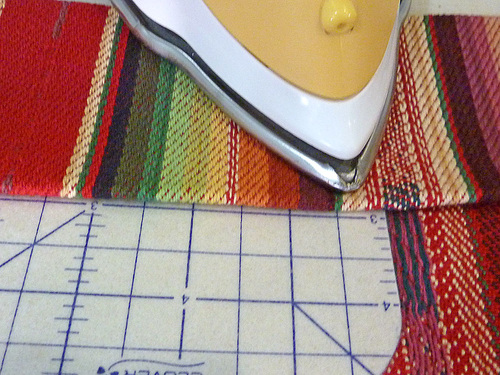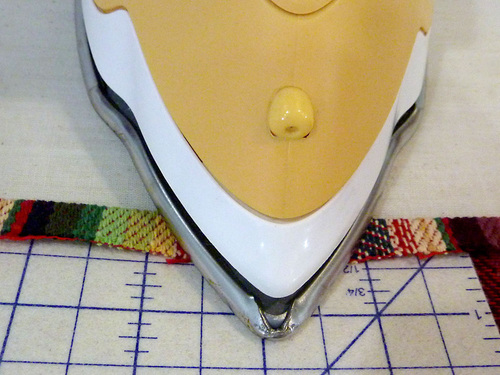 - Find the two exterior side panels. Fold down the top raw edge of both panels ½” and press to set a crease. We used our Clover Hot Hemmer.