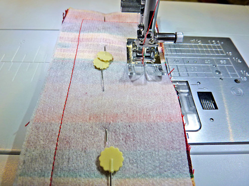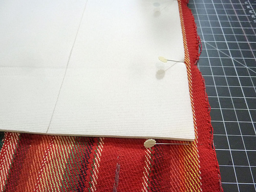 - Find the main lining panels. Pin the two panels right sides together along each 8” side.