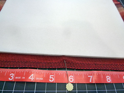 - Place the two fused exterior panels right sides together. The raw edges of the panels should be flush on all four sides. Make sure the fused foam panels are also aligned front to back. Pin along the two 13” sides.