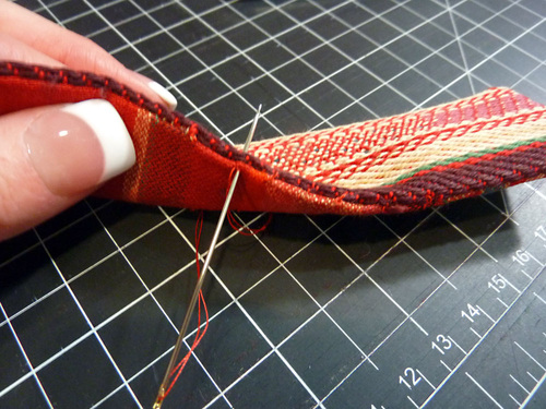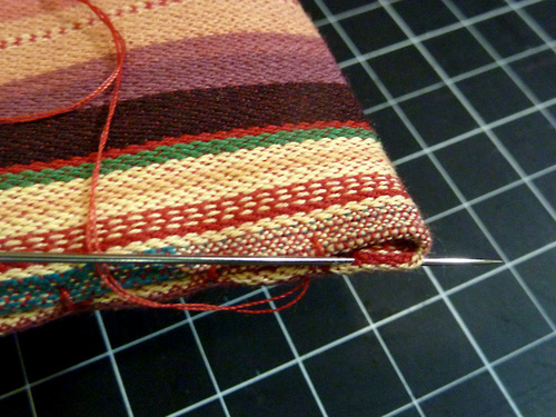 - Turn the handle right side out through the opening. Gently push out and square all four corners with a blunt-end tool, such as a knitting needle or chopstick. Press flat, pressing in the raw edges of the opening so they are flush with the sewn seam. Hand stitch the opening closed.