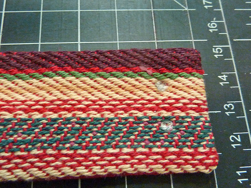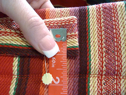 - On each end of each handle, mark the placement for the rivets: ½” in from the finished end, ½” down from the top and ½” up from the bottom. These measurements are from the finished edge of the fabric to the center of the rivet. There are two rivets at each end.