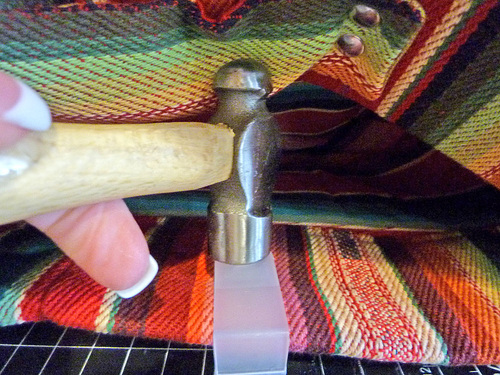 - Insert the rivets, striking the top of the tool with a hammer to secure the back of the rivet against the top stud of the rivet.