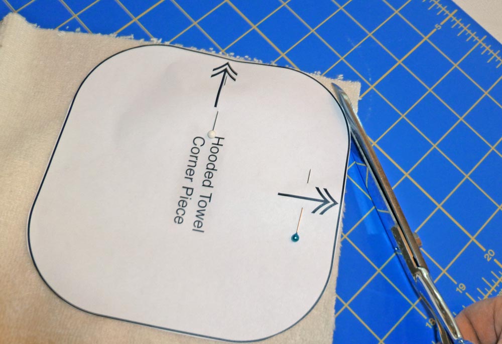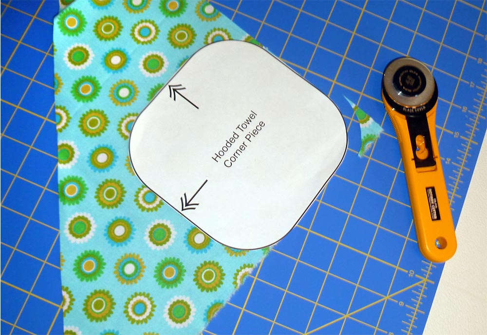 Using the washcloth pattern (as noted on the pattern piece, you cut along the fold), cut ONE - Using the Hooded Towel Corner Piece pattern as a template, round all four corners of the 30″ x 30″ towel square.