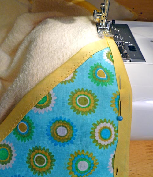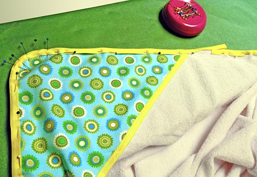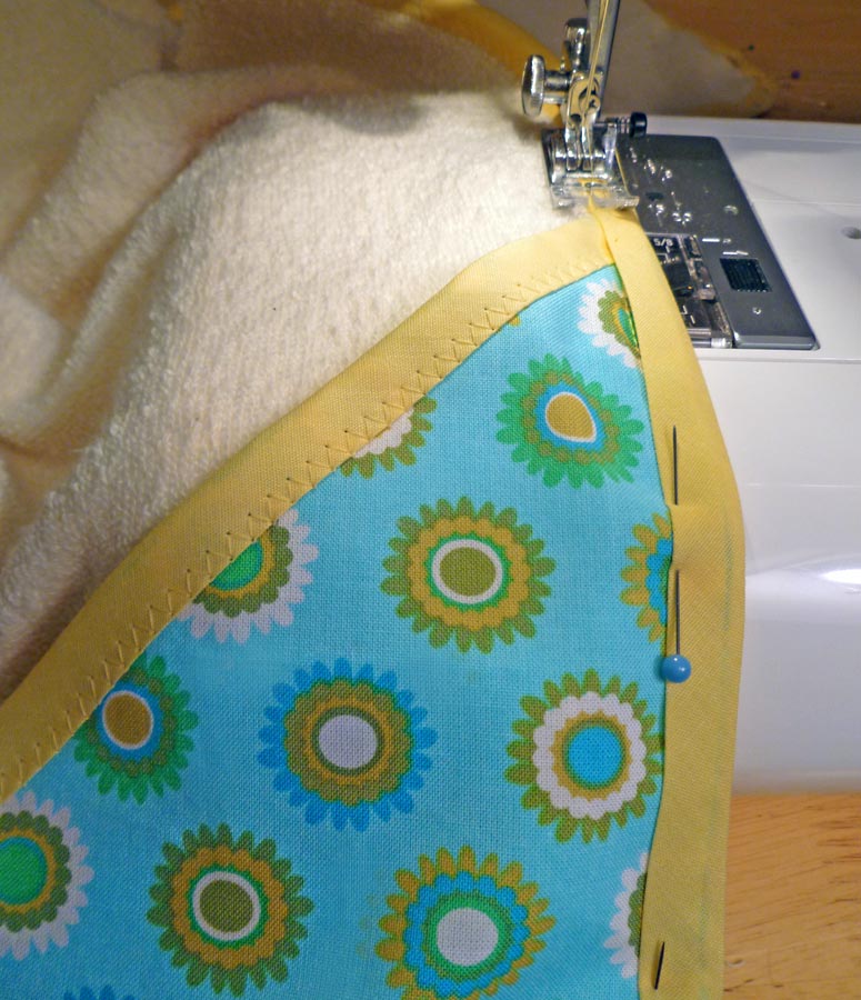 NOTE: As above with the hood, we simply slipped the binding over the raw edges of the towel and hood. If you selected a thicker terry cloth and created your own bias binding, we would recommend you use the traditional two-step binding method described above.
